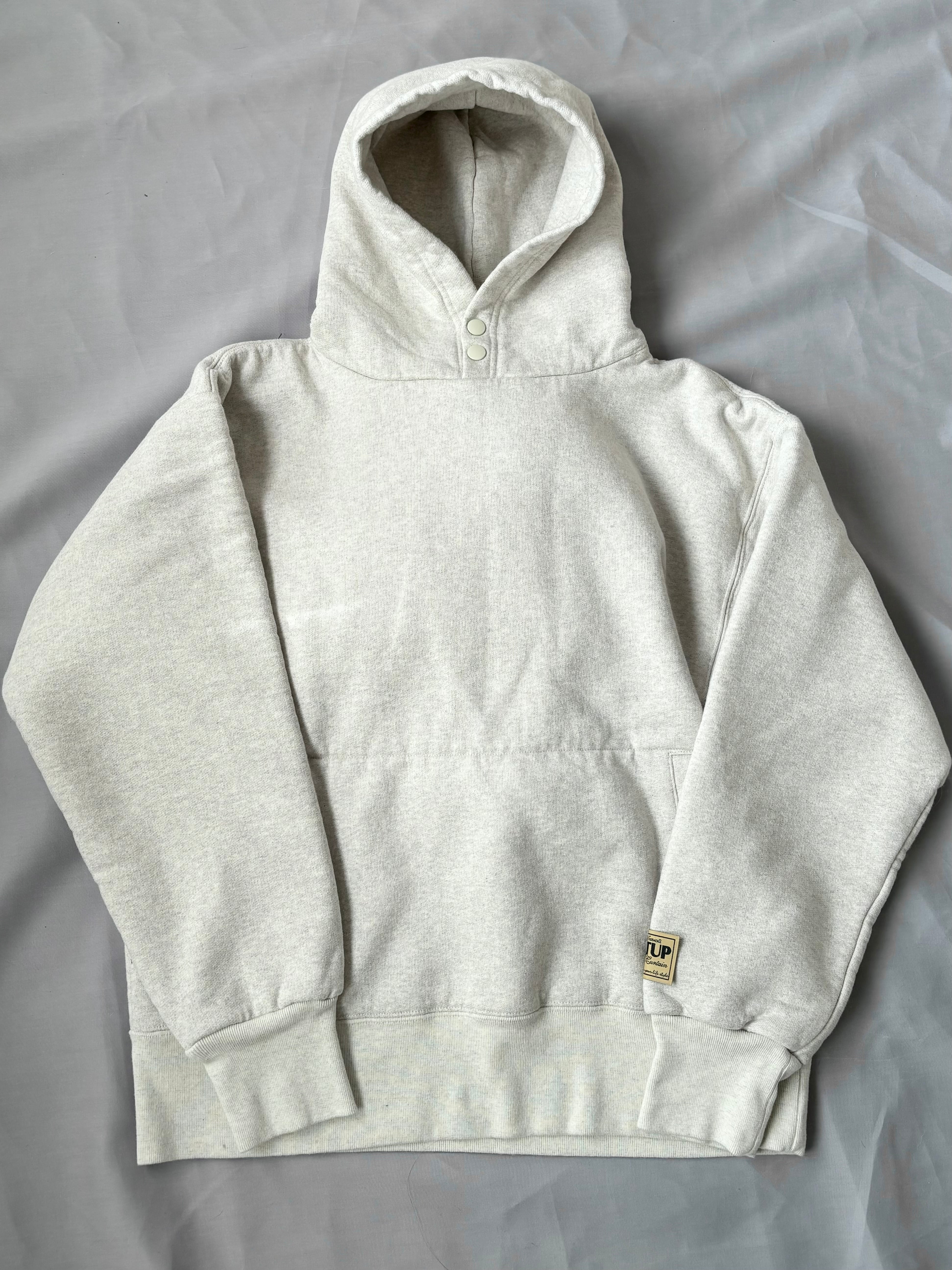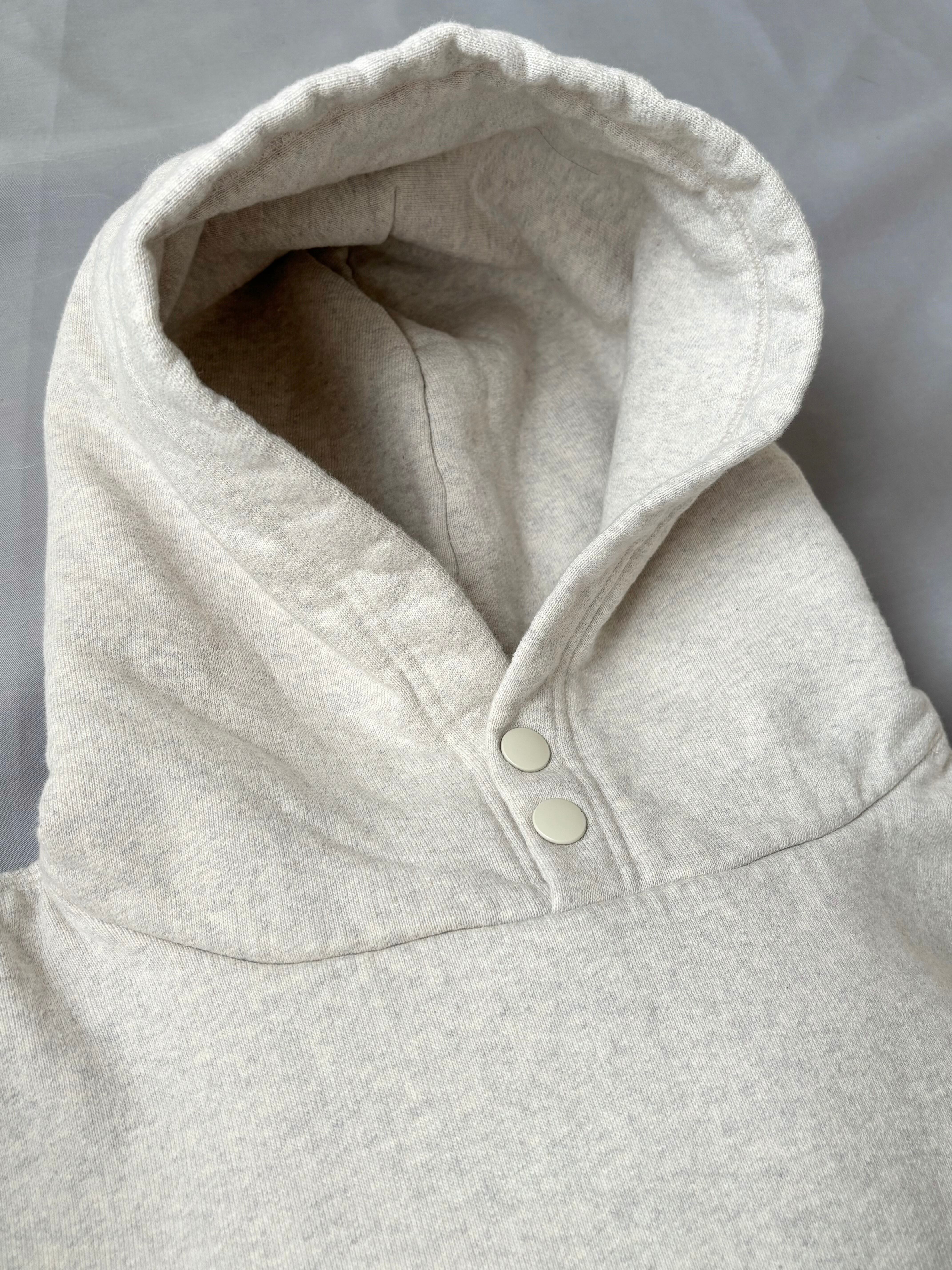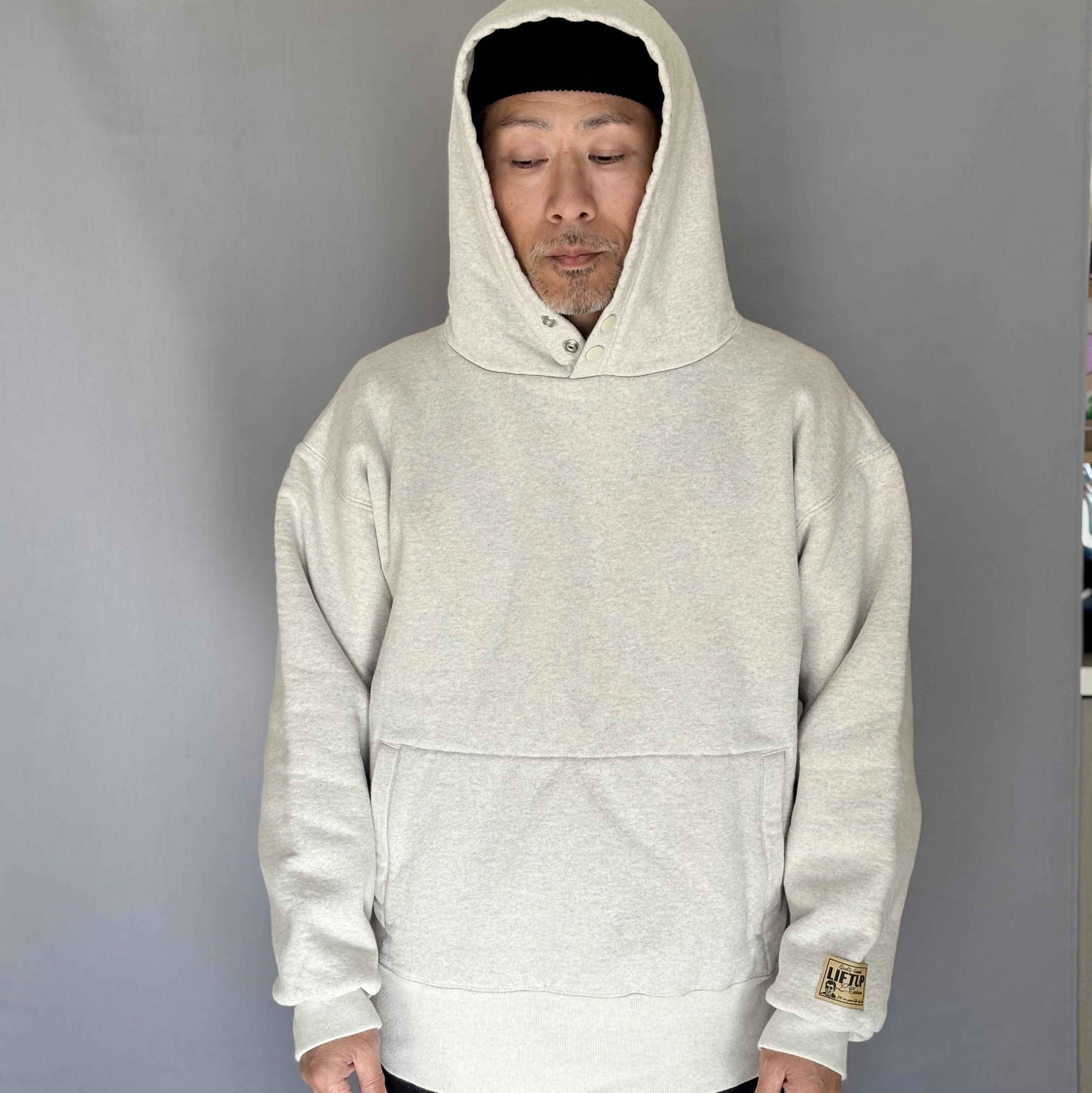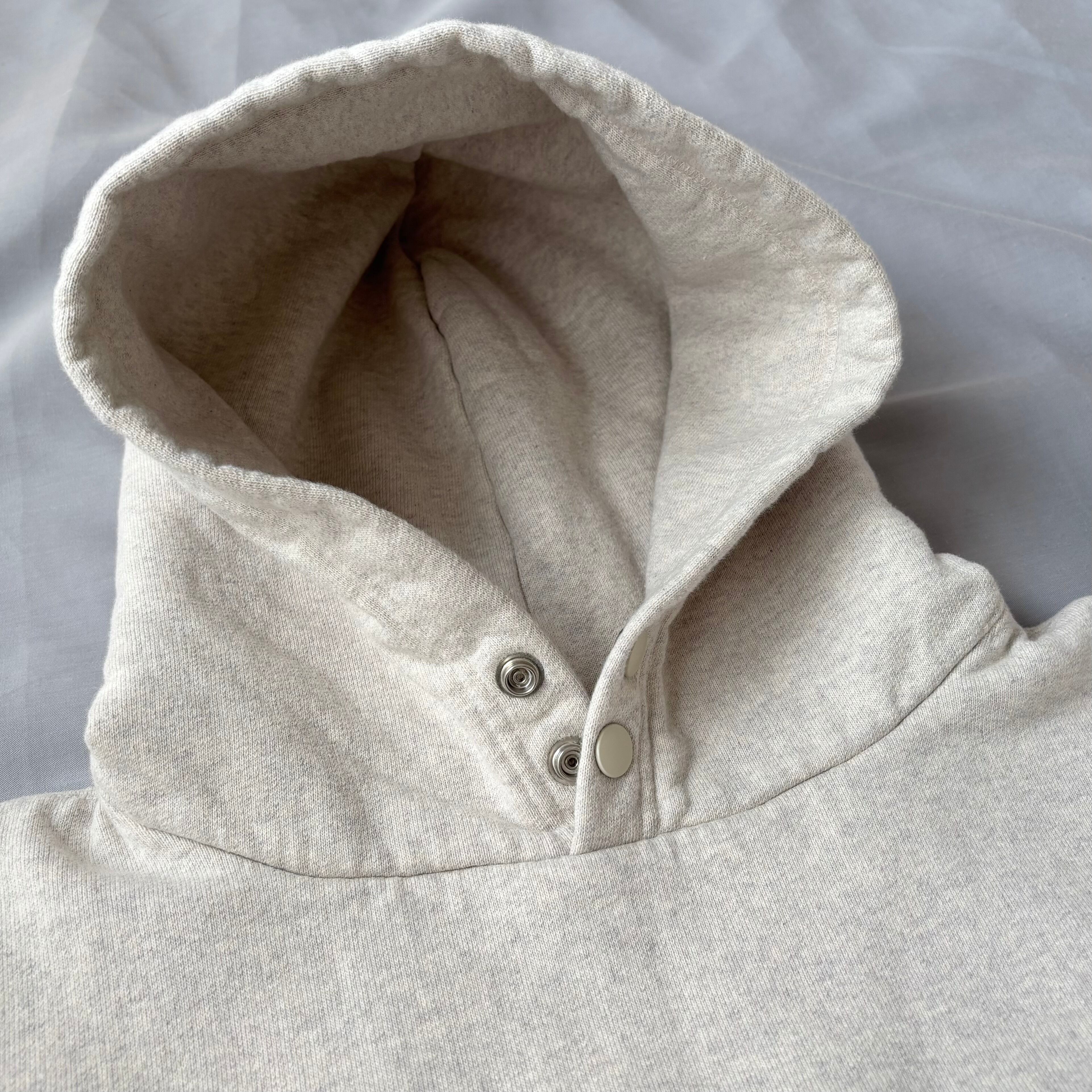 フードは立ち上がりの良い二重構造で、首元のスナップボタンで風の侵入を防ぎます。